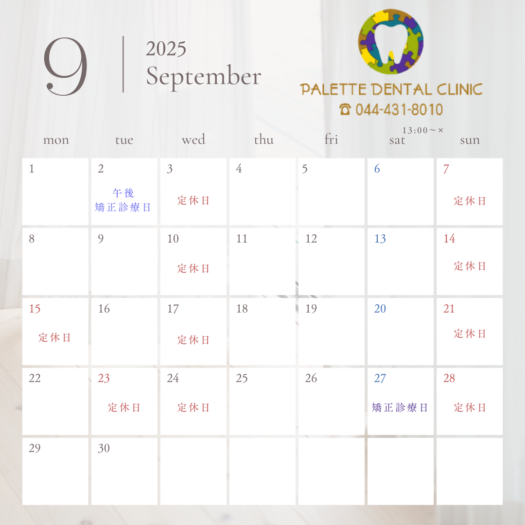 2025.09.13 9月診療スケジュールのご案内 ◾️9月診療スケジュールのご案内◾️ 平素より当院をご利用頂き誠にありがとうございます。 9月はカレンダーの日程を休診とさせていただきます。 < 前の記事 新着一覧 次の記事 >